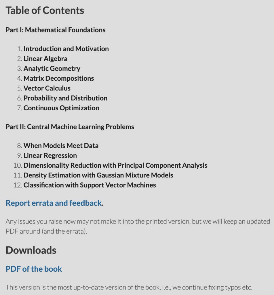 《面向机器学习的数学(Mathematics for Machine Learning)》是一本新书,由伦敦帝国理工学院的几位教授出版,于2020年出版,该书pdf电子版是完全公开的,在该书主页可以直接下载:https://mml-book.github.io/