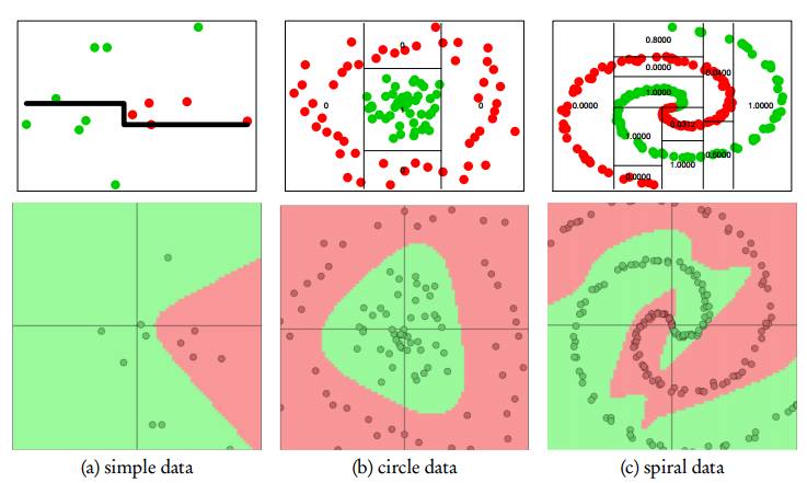 图 6:由树型架构(顶行)和深度学习架构(底行)对三个不同数据集做所得的空间划分结果