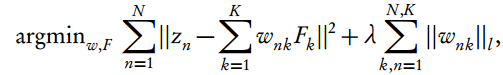 其中 l 等于 1 或 2,即可用 L1 范数或 L2 范数。现在我们最小化重构误差(即精度)并加上正则化罚项以控制其他样本预测的方差-偏差均衡。现有很多算法可以高效地解决这类问题,比如说如果采用 L2 范数和高效的激活函数就能将模型表征为神经网络模型。