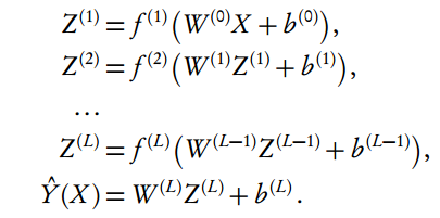 现在定义 Z (l) 指代第 l 层神经网络,所以输入向量 X 就可以表示为 Z(0)。最终的输出是 Y,其可以是数值型(numeric)或分类型(categorical)。因此,深度预测规则就可以表达为: