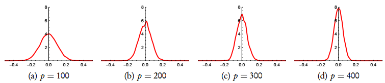 图 4:Y ∼ U(Bp) 的边缘分布直方图,其中 p 为不同的维度数量。