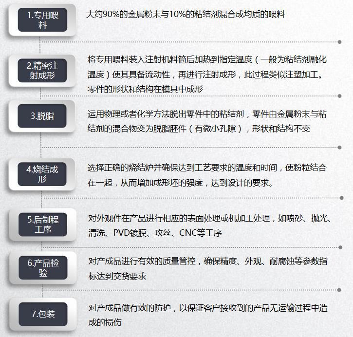 从工艺流程来看,MIM要经历混料(专用喂料)、注射成形、脱脂、烧结、后处理等5个步骤。
