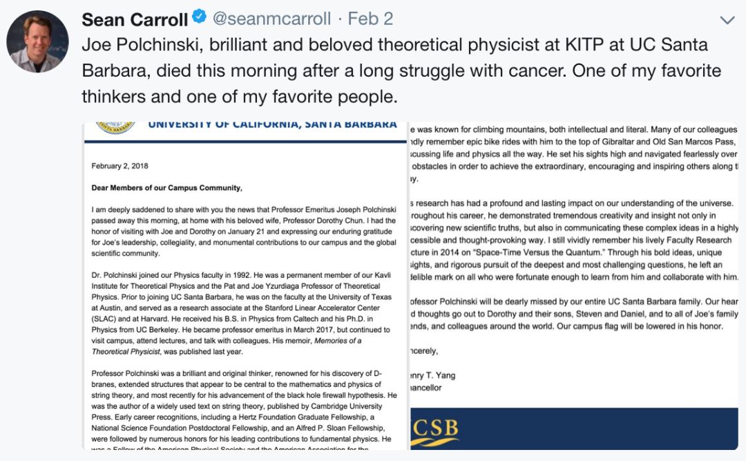○ 2018年2月2日,著名的物理学家Sean Carroll在twitter上发布了Polchinski教授去世的信息。
