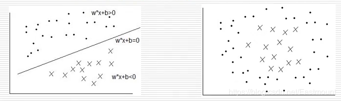 在二维坐标轴中,可以设计一条直线将空间内分布的散点区分开来,如下图所示。