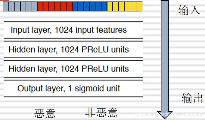 得到特征向量之后,就开始进行模型的训练和测试,一般机器学习任务事先都有一个数据集,并且会分为训练数据集和测试数据集,按照4比1或9比1的比例进行随机划分。训练会将数据集和标签对输入得到恶意和非恶意的结果,再输入测试集得到最终结果。