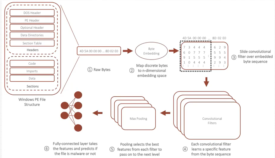 然后将矩阵输入到卷积和池化层中,比如存在一个100K字节的二进制文件,得到100102410矩阵输入卷积神经网络中,最后通过全连接层完成恶意和非恶意的分类任务。