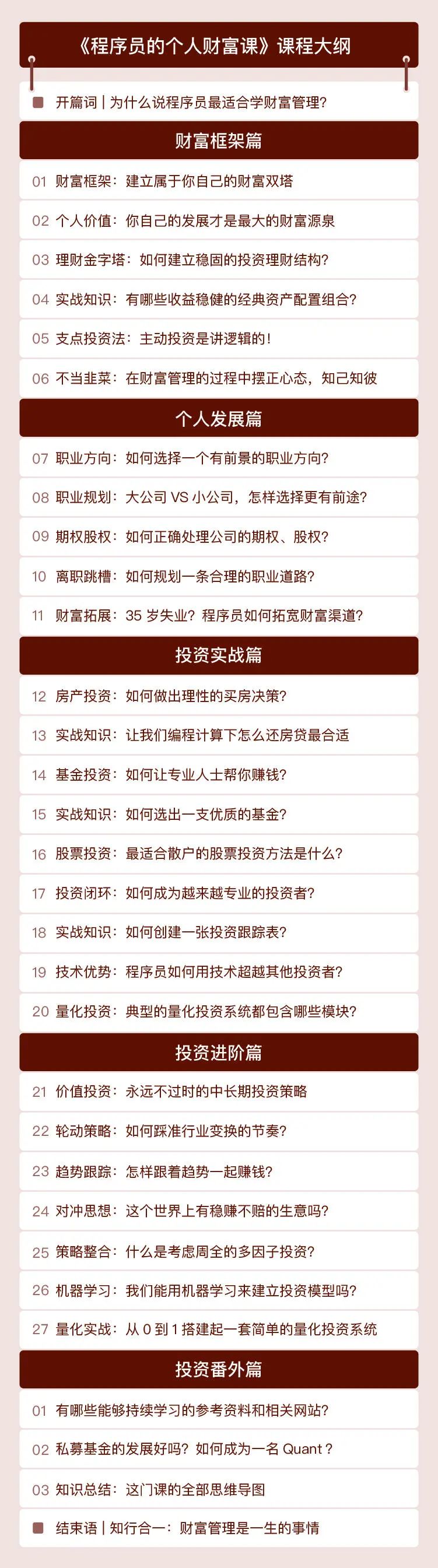 具体来讲,他把课程分成了财富框架、个人发展、投资实战、投资进阶四大模块,按照由总到分、由浅入深的逻辑,助力你搭建起专属的个人财富体系。