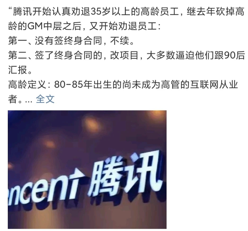 最近团队优化掉了两个人,搞得内部有些人心惶惶,也让我想起了去年的“腾讯开始认真劝退高龄员工”的新闻。