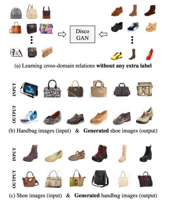 大家比较看好的一个应用是特征转变。例子就是下图。GANs根据包包的特征,绘制出一个同等特征的鞋子。这就意味,今后可能出现超级网店。你搜了一些包包。突然发现,店铺推荐了匹配的鞋子。而且你搜遍其他地方,根本找不到这些鞋子。你只好下单了。其实,你下单之前,这些鞋子是不存在的,这些鞋子是GANs根据你的喜好,临时设计出来的。你下单的同时,超级工厂才开始生产你的鞋子。