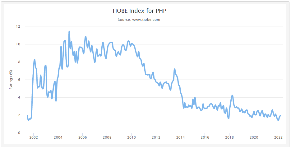 就 2022 年的形式来看,为项目选择 PHP 不再是一个明智之举,除非是暂时的。如果你非常注重项目的发展,则应该选择一种现代语言。一种正在上升或达到顶峰期的语言。这不仅可以保证将来的安全,而且也可以保证项目的持续生存和增长。