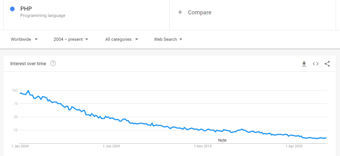 如果你的目标是在未来几年中加速项目的发展,那么分析技术的发展趋势会非常有价值。长期项目需要选择正确的技术。你不希望有朝一日被困在一个逐步衰亡且缺乏支持的技术中。下图来自 Google 的趋势分析,为我们展示了过去十多年间 PHP 的发展。