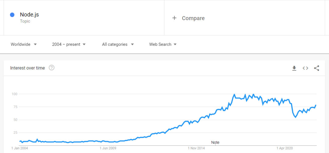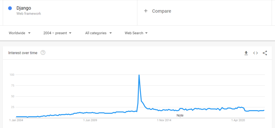 Node.js 获得的关注度高于 Django。显然,很多人都很喜欢它。但相似的是,这两个框架都在增长。未来它们都会变得非常强大。