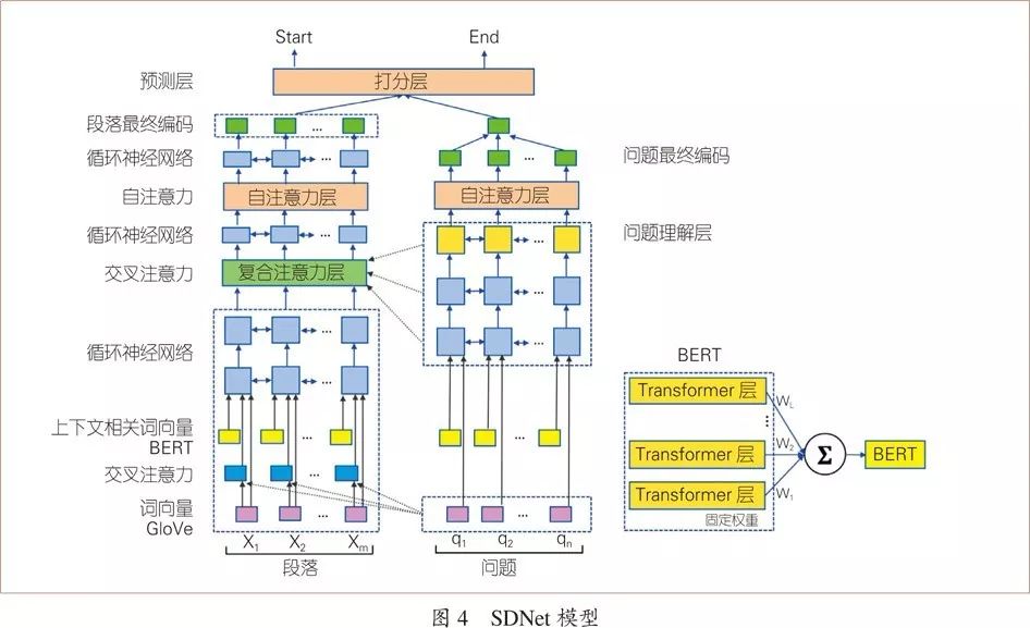 在实际模型中,以上三个核心模块均会有不同变种,例如更多的循环神经网络层数、注意力机制的反复使用等。图4展示了最近在机器阅读理解多轮问答数据集CoQA上获得第一名的SDNet模型[12]。该模型使用了BERT输出层的线性组合以及复合注意力层的模块,获得了很好效果。