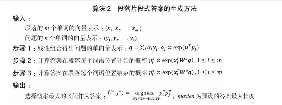 对于多项选择类型的答案,可以通过神经网络中的线性变换层生成每个选项的概率,并通过交叉熵求导优化。对于段落片段类型的答案,一般是计算段落中每个位置作为答案开始和结束的概率,并选择概率最大的区间输出。算法2给出了一个典型的段落片段类型答案的生成方法,其中u,Ws,We均为参数。