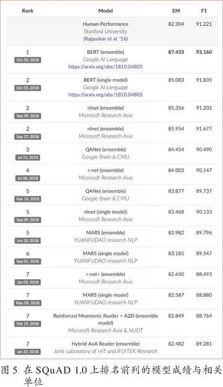 值得一提的是,在影响力很大的机器阅读理解竞赛SQuAD中,微软亚洲研究院、国防科技大学、哈尔滨工业大学与讯飞联合实验室等中国团队排在前列3(见图5)。