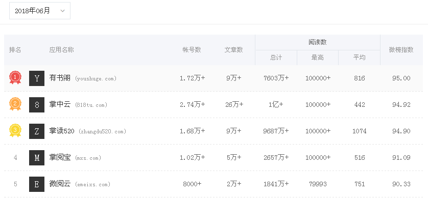 通过查阅爱微帮的数据,可以看到有书阁、微阅云在接入的微信公众号和文章数上面都排名前列。