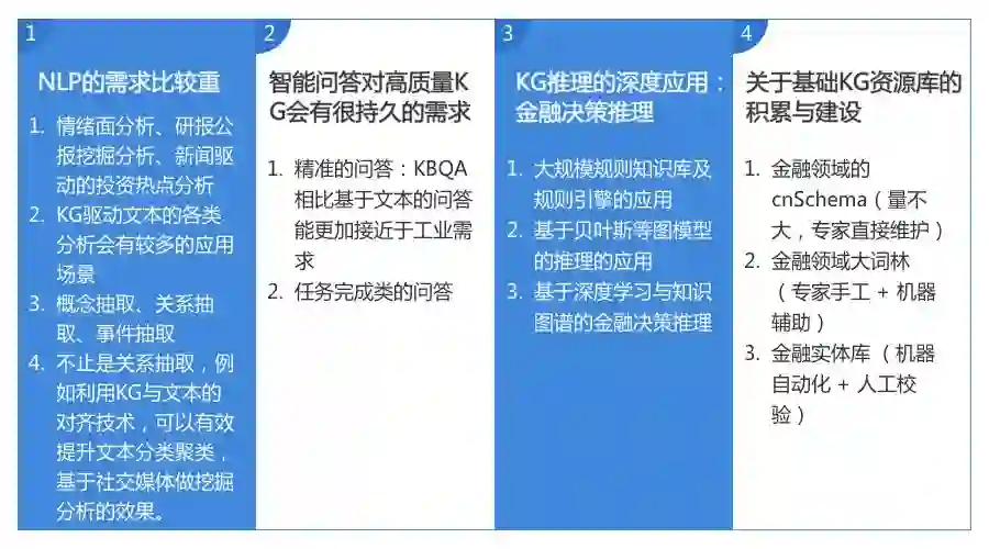 此外金融领域还有一些比较适合于做知识图谱的特点,如文本资源非常丰富,且动态性非常高。大量高度动态的新闻、公报、研报都是自动化获取知识图谱的有力来源,在这方面,我们可以较为深入应用实体识别、大规模自动化词库构建、结合远程监督和深度学习的关系抽取等多方面的图谱构建技术。只要一点一点积累高质量的知识图谱,结合深度学习和自然语言处理等领域的最新进展,金融知识图谱会发挥出门槛式的重大价值。