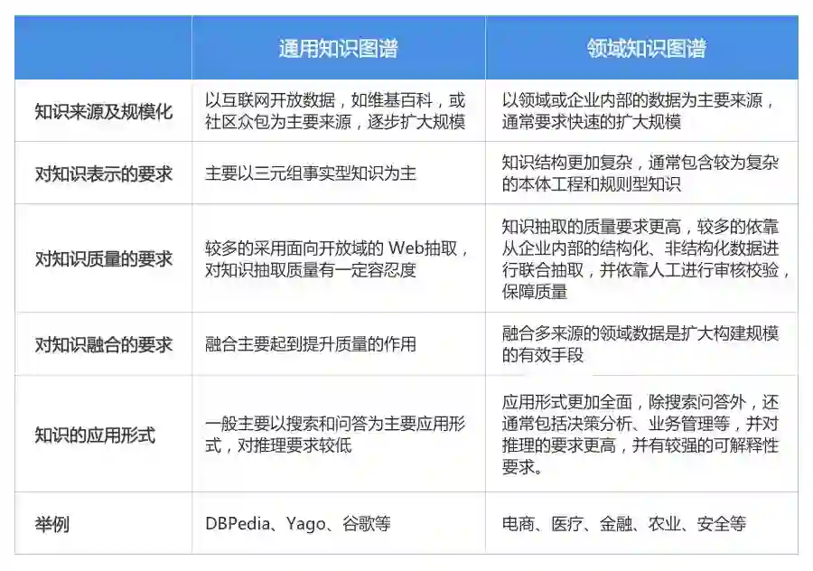 领域知识图谱是相对于通用知识图谱(如DBPedia、Yago、Wikidata等)而言,面向特定领域的知识图谱,如电商、金融、医疗等。相比较而言,领域知识图谱知识来源更多、规模化扩展要求更迅速、知识结构更加复杂、知识质量要求更高、知识的应用形式也更加广泛。