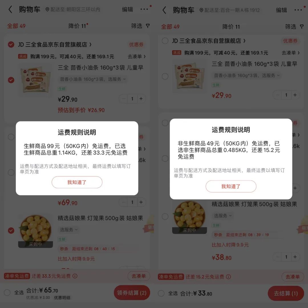 但电商自营却不愿意惯着消费者。如天猫超市需要满88元包邮,京东自营非生鲜49元包邮,生鲜99元包邮。