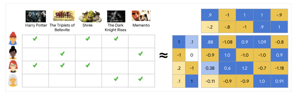 同样,我们用dot方式,计算user和item的分数表示用户对电影的偏好。如下图中的问号,就是0.1 * 1 + 1 * -1 = -0.9,表示该用户对该电影没兴趣。这里是直接指定user和item的embedding的,实际是自动学习到的,接下来就说到矩阵分解。