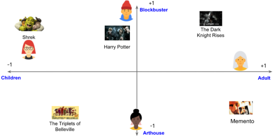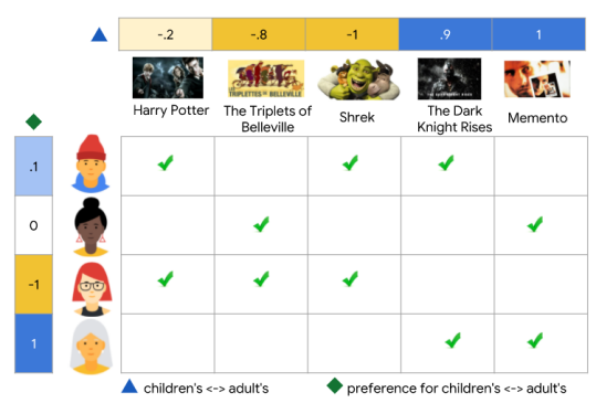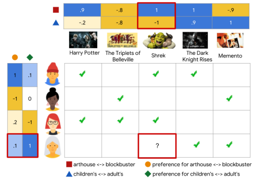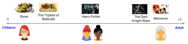 假设user和item的embedding是1维的,对于user而言,向量接近1表示他喜欢成人电影,向量接近-1表示他喜欢儿童电影,对于电影而言,越接近1表示是成人电影,越接近-1是儿童电影,每个user和item的向量如下图: