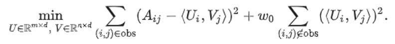 如果把未观测的都填成0,也是有问题的,这样UV就会解决0矩阵,导致模型泛化能力弱。所以给未观测的损失,给一个权重w0,调整这个w0对最终模型泛化能力影响比较大。