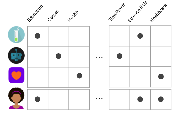 基于内容的协同过滤,如下图所示,需要专家人工挖掘出大量特征,如果user和item有这个特征,就标为1,如下图所示。然后就可以dot计算相似度,我们可以知道,如果一个user和一个item在某一个特征都是1,那最终dot就会累计1,如下图女孩和第一个app 都有Education和Science R Us特征,所以它们点积为2,所以图中app推荐第一个app给她。
