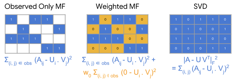 但是这种方式,只计算了有值部分的误差,我们知道Ai,j是非常稀疏的,因此用上述公式优化可能导致模型泛化能力较弱,所以又有了各种优化目标: