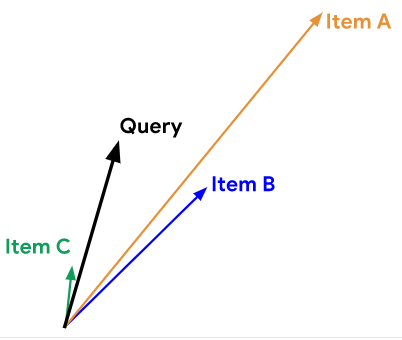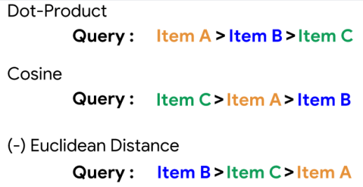 使用不同的度量公式,最终推荐结果区别也是很大的,比如下图1个query向量和3个item向量