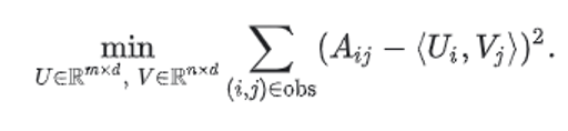 给定一个反馈矩阵Rm*n,m是user数量,n是item数量,要学到user向量Um*d,和item向量Vn*d,最后使得UV约等于Ai,j即可,如下图: