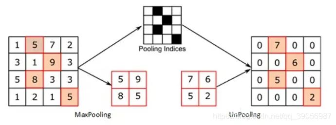 Max Unpooling,在对称的max pooling位置记录最大值的索引位置,然后在unpooling阶段时将对应的值放置到原先最大值位置,其余位置补0;