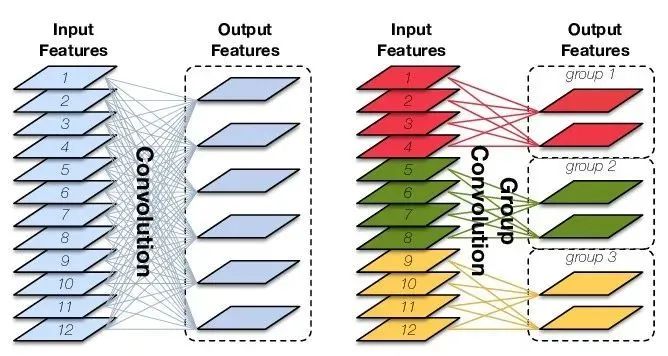 Group Convolution(分组卷积)就是对输入feature map在channel维度进行分组,然后每组分别卷积。设分成G组,参数量减少为原来的1/G。如下图所示: