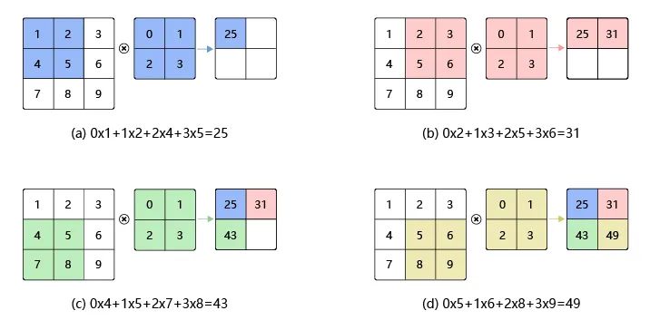 卷积运算的方式就是将滑动的窗口与卷积核进行点对点 (elementwise) 的相乘,再将乘完的值相加