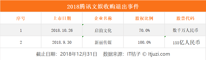 上市退出之外,2018 年腾讯也借收购之际,成功退出 2 家企业。
