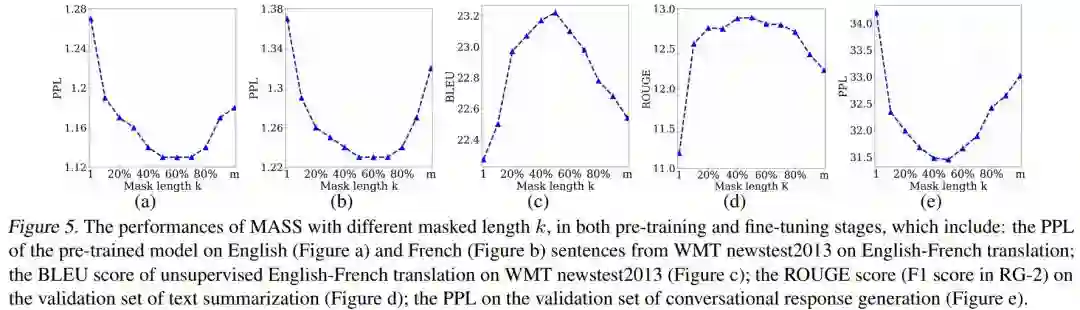 我们通过实验分析了屏蔽MASS模型中不同的片段长度(k)进行预训练的效果,如下图所示。