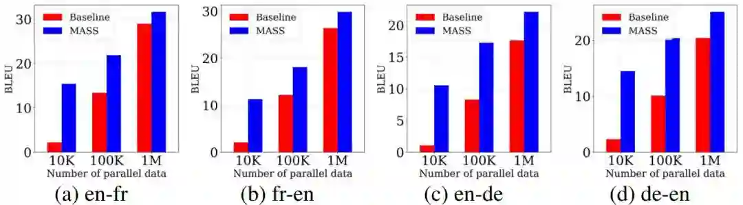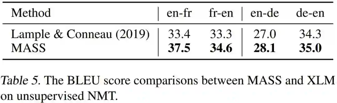 可以看到,MASS的预训练方法在WMT14英语-法语、WMT16英语-德语一共4个翻译方向上的表现都优于XLM。MASS在英语-法语无监督翻译上的效果已经远超早期有监督的编码器-注意力-解码器模型,同时极大缩小了和当前最好的有监督模型之间的差距。