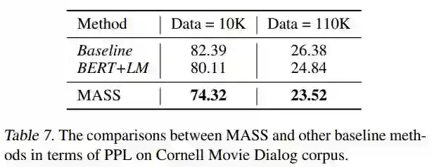 在对话生成(Cornell Movie Dialog Corpus)任务上,我们将MASS同BERT+LM进行了比较,结果如下表所示。MASS的PPL低于BERT+LM。