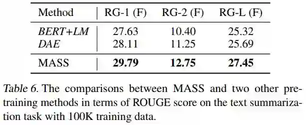 在文本摘要生成(Gigaword Corpus)任务上,我们将MASS同BERT+LM(编码器用BERT预训练,解码器用标准语言模型LM预训练)以及DAE(去噪自编码器)进行了比较。从下表可以看到,MASS的效果明显优于BERT+LM以及DAE。