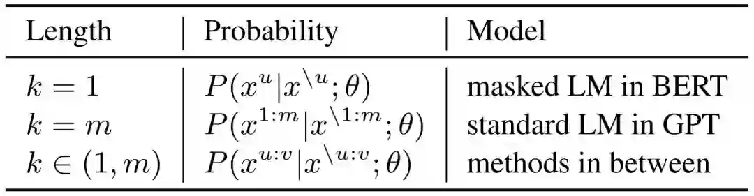 MASS在不同K下的概率形式如下表所示,其中m为序列长度,u和v为屏蔽序列的开始和结束位置,x^u:v表示从位置u到v的序列片段,x^\u:v表示该序列从位置u到v被屏蔽掉。可以看到,当K=1或者m时,MASS的概率形式分别和BERT中的屏蔽语言模型以及GPT中的标准语言模型一致。