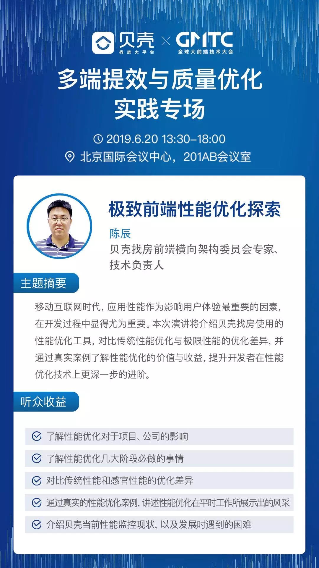 6 月 20 日,2019 GMTC 全球大前端技术大会 《多端提效与质量优化》技术专场,我们邀请了贝壳找房前端架构负责人、慕课网认证前端性能讲师陈辰(cc),为大家解读《极致前端性能优化》,介绍贝壳找房使用的性能优化工具,对比传统性能优化与极限性能的优化差异,并通过真实案例了解性能优化的价值与收益,提升开发者在性能优化技术上更深一步的进阶。