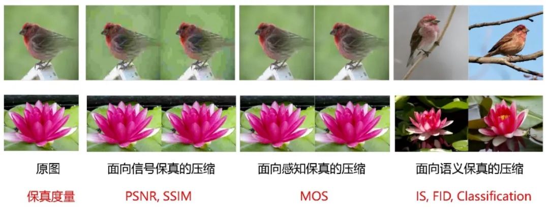 近年来图像、视频数据的信息量呈指数级提升,尤其是用于机器分析的数据量相较以往显著增加。因此,在图像/视频等数据的压缩框架中,语义保真相比传统的信号保真变得越来越重要(不同保真的对比如图1所示)。因为信号保真是面向信号层面的,也与机器分析的要求有明显的差异,所以广泛使用信号保真的传统的压缩方法与机器分析的要求并不一致。除此之外,场景视频的语义信息,例如行人相关的身份,数量,或者车辆的流量等,而不是原始的场景图像,也变得越来越重要,这一类需求称之为语义监督。然而,传统的基于块划分的图像/视频压缩框架主要在特定码率约束下优化数据的信号保真,已经不能满足日益增加的机器分析和语义监督的需求。近期的特征压缩的框架将深度神经网络的中间层或者最终层的特征通过量化,压缩和熵编码来将重点放在语义特征上。但是特征压缩有如下不足之处:(1)它一般面向具体的任务,换一个任务往往需要使用新的特征;(2)这种特征一般是人不可理解的,所以不能用于相关的语义监督;(3)如何从这种任务相关的特征中重构出原始的数据,依然有待研究。为了弥补以上不足,本文尝试提出一种人可以理解的语义压缩框架:跨模态压缩。