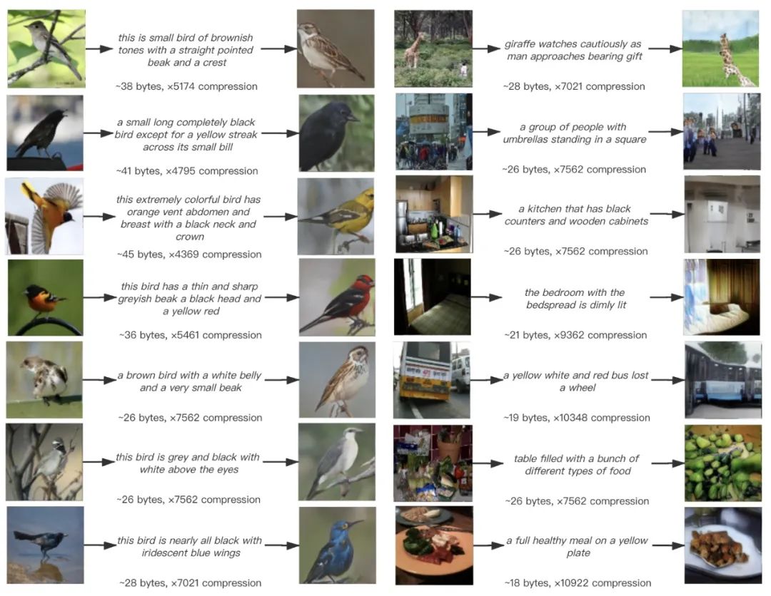图 4:图像-文本-图像的跨模态压缩框架在CUB200数据集(左)和MS COCO数据集(右)上的主观结果以及压缩倍数