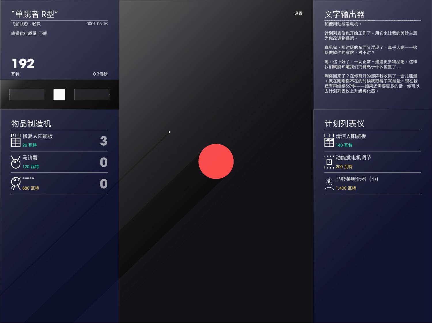 游戏的主要操作方式仅仅需要你不断的敲击一个手动发电按钮来为飞船提供一点电力,然后慢慢去修复太阳能电池板以及利用马铃薯来发电。游戏主要的操作方式基本只有反复按下那个发电按钮,按到你手抽筋为止......以及一边看着人工智能助理作为旁白风趣的描述现在情况与发出各种调侃,一边不断升级供电系统和制造马铃薯探测器(别问我那是啥)来发掘被隐藏的星系级秘密。(注:游戏内容有官方完全汉化,并且翻译质量优秀。)