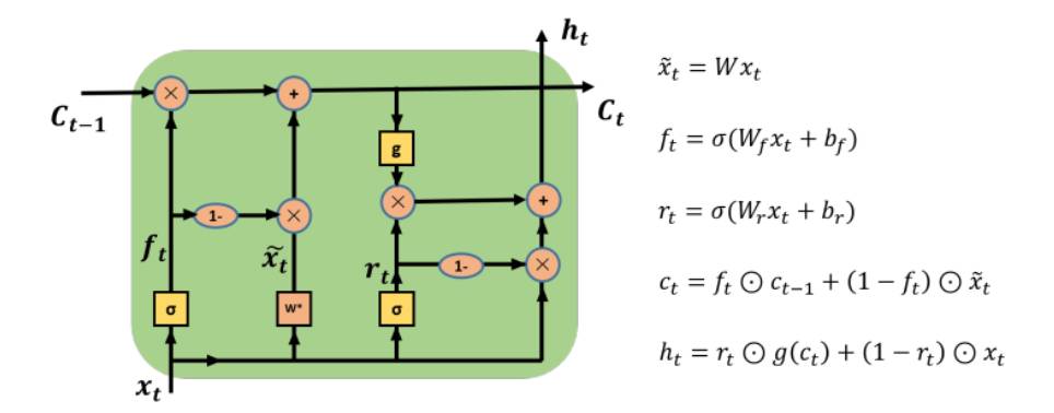 熟悉LSTM的人很容易理解SRU的网络结构图,下图是SRU的网络结构图: