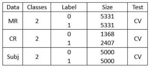 下图是MR、CR、Subj数据集的详细信息,测试采用十折交叉验证,下载数据从