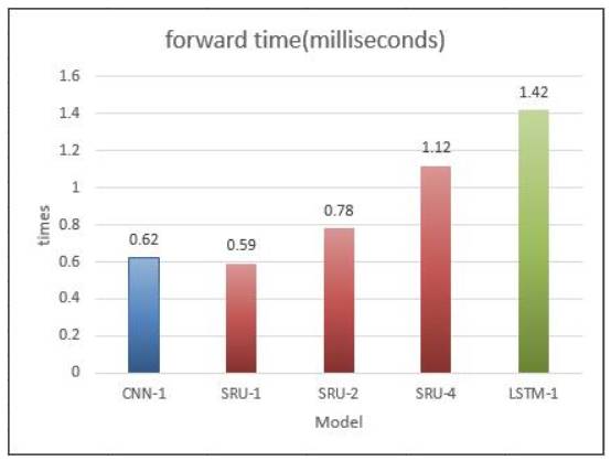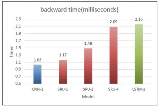以下实验结果是在Twitter数据集上对forward和backward测试的平均运行时间,其中SRU、LSTM、CNN都是经过CUDA优化的,CNN的kernel-size=3,SRU和LSTM的隐层维度是300,三个模型的batch size是16,以毫秒为单位计算,图中SRU-1代表一层的SRU模型:
