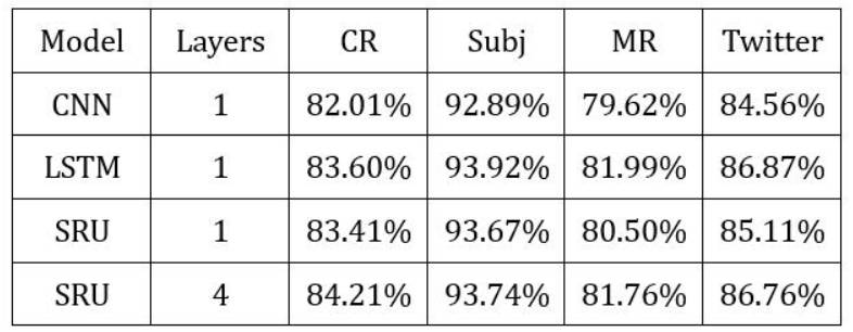 实验结果:在四个数据集上SRU与LSTM的准确率相差不大,有的数据集(像CR、Subj)一层的SRU效果就能达到一层LSTM的效果,但是在MR、Twitter数据集上一层的效果反而不是很好,需要叠加多层SRU才能达到LSTM一层的效果,这与上文提及的Highway Connection有很大的关系。