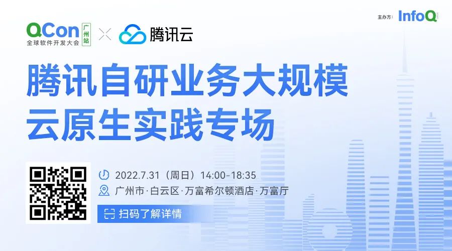 7 月 31 日 14:00, QCon 全球软件开发大会将落地广州,大会设置了「腾讯自研业务大规模云原生实践」专场,邀请了腾讯多位技术专家现场分享腾讯云原生实践经验及技术思考,此次专场议题涵盖云原生、数据库、软件供应链安全、异构计算、大数据等,不要错过现场交流的机会~~ 感兴趣的同学请扫码或点击阅读原文报名。