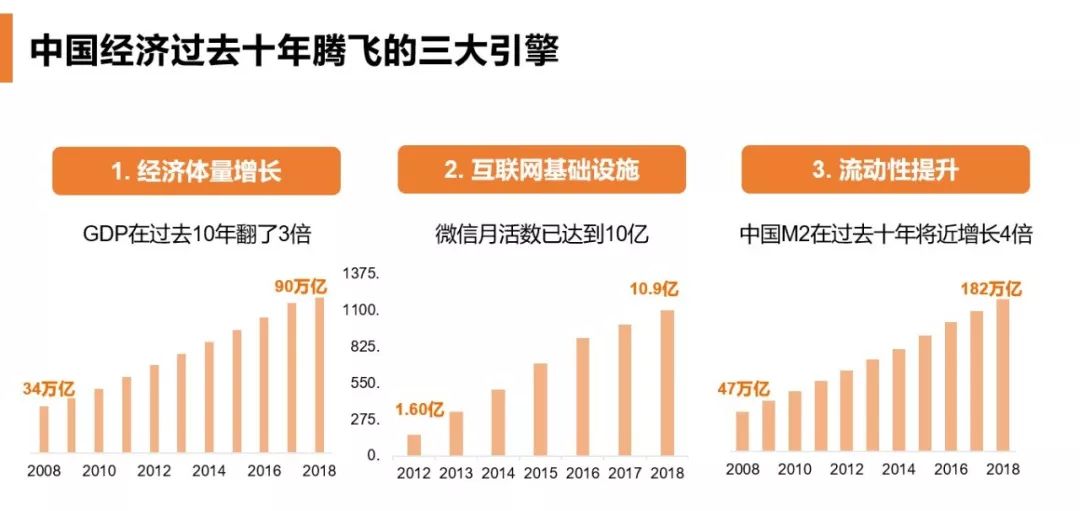 另一个宏观背景是,2008年到2018年,中国GDP增长了三倍,M2(广义货币供给)增长了四倍。经济总量和流动性的提升,为创业者的冒险提供了源源不断的燃料,让他们有充足的钱在中国市场的前端整合交易。