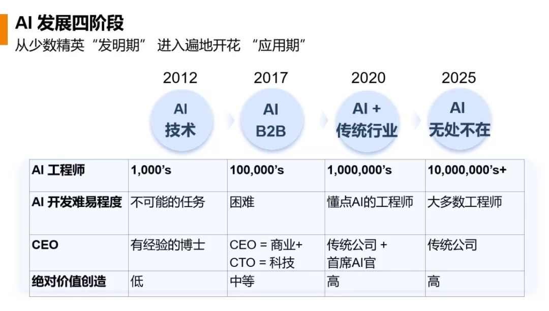 AI技术时代,AI B2B时代,AI+传统行业时代,以及 AI 无处不在的时代。